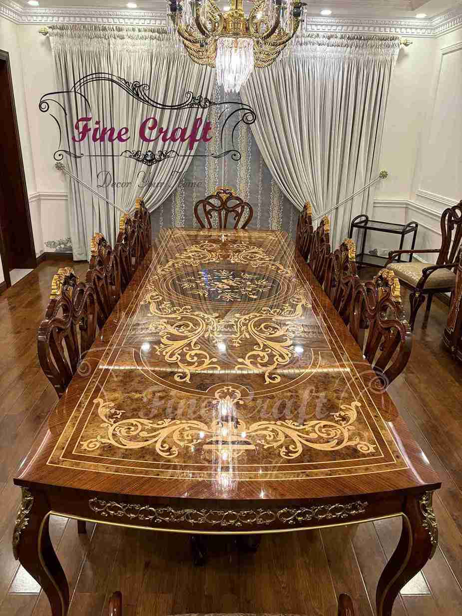 This exquisite luxury dining table is a true masterpiece of craftsmanship, designed for those who appreciate refined living and timeless beauty. Expertly crafted from solid wood, the table showcases exceptional durability and strength, ensuring it remains a centerpiece for generations.
